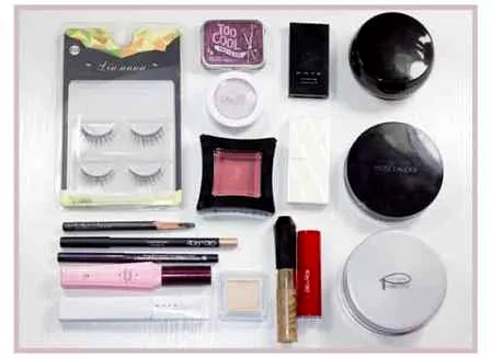 ILLAMASQUA妆前啫喱保湿版、ESTEELAUDER沁水粉凝霜#2C0、ESPRIQUE双色遮瑕#02、PIABELPIA防晒散粉、COLOURPOP高光#HIPPO、ILLAMASQUA腮红#BEG、SHU UEMURA砍刀眉笔#05、KATE三色眉粉#EX05、KISS ME染眉膏#-03、MUJI眼部打底膏、TOO COOL FOR SCHOOL双色眼影#05、G&R眼线笔#302STILA防水持久眼线笔#PURPLE TANG、KATE睫毛打底膏、DOLLY WINK纤长睫毛膏。