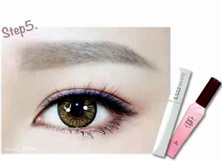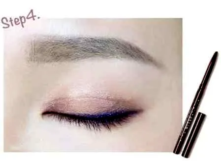 第四步:眼线胶笔画眼线,眼头贴近睫毛根部,眼尾慢慢加粗,眼头用眼线刷沾眼线胶笔慢慢描画。