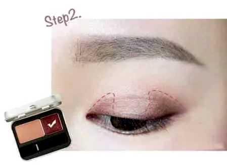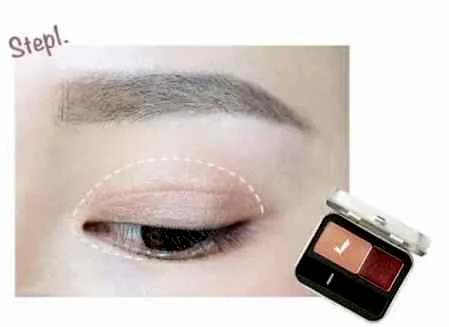 第二步:酒红色眼影分别画在眼尾和眼头部位,中间留空,范围不要太大,否则容易产生家暴感。酒红色眼影画下眼尾。