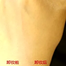 评测方法:首先在手背上涂抹适量的粉底液后,再用dhc卸妆油卸除部分粉底液,对比卸妆前与卸妆后的效果。