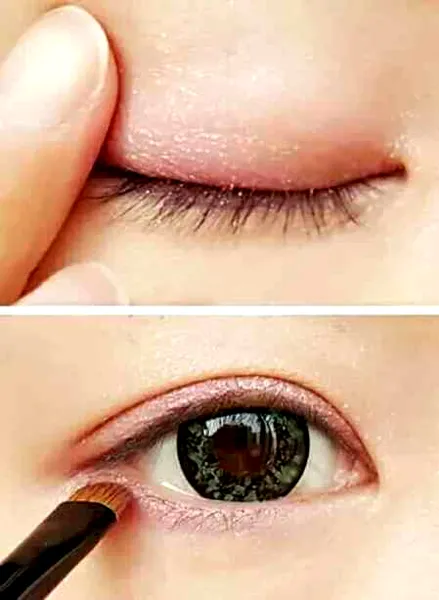 用粉嫩粉嫩的粉色眼影笔在双眼皮处以及下眼尾的三角区轻轻涂抹。