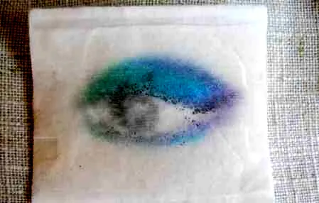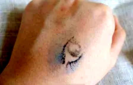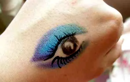 首先,在手背上涂上眼影、眼线、睫毛膏等,这里画成了一只眼睛,眼珠是用眼线笔画的,睫毛是眼线液,然后就是不同颜色的眼影啦。