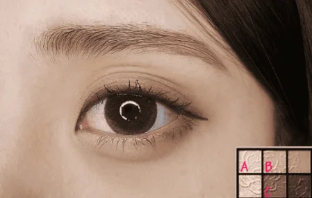 2.A色在眼部打底,带闪的B色提亮上眼皮前2/3,C色加深上眼皮后1/3,A色提亮卧蚕或眼头位置。