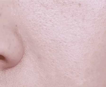 素颜皮肤,白皮,中性皮肤,脸颊有毛孔,鼻翼轻微泛红,有小斑点。