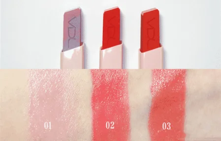 唇膏只有01号色是这种粉蓝色,其他两只是常规的西瓜红和橘色。但02/03颜色不挑皮,无论是黄皮、白皮都可以用,标准的韩系配色。