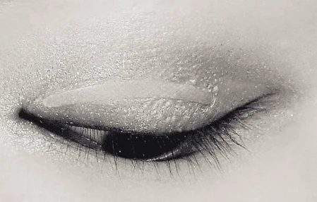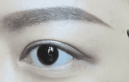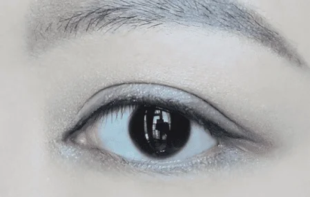 再用黑闪色在眼尾的三角区域轻轻晕染,加深眼窝,再用余粉加深眼头三角区域,涂抹在整条外眼线位置并稍加晕染。