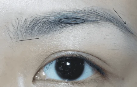 第一步:灰色眉笔将眉头轻轻填匀,眉中较浓强,调向下的眉毛走向,往后一些填出没有杀伤力的眉峰,眉尾较淡,也是画出向下的眉毛走向。