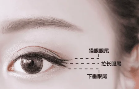 第二步:大家画的比较多的眼尾有三种。猫眼眼尾能让妆容更魅惑,眼妆更飞更上翘的既视感。适合轮廓立体的妹子画。拉长眼尾能让眼睛看起来更纤长,特别适合这种眼睛比较圆,眼距比较近的妹子。下垂眼尾能够打造出超级无辜的妆感,也就是俗称的“狗狗眼”,韩妆也很喜欢画这种。