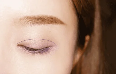 第三步:珠光紫色眼影,植村秀无色限眼影ME785用中号眼影刷沾取,刷在双眼皮褶皱内,边缘晕染开,画在图示范围内。