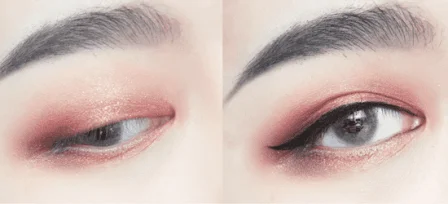 第二步:紫棕色眼影加深眼尾三角区,余粉扫过下眼尾。眼线笔拉出眼线,眼尾略上翘,下眼头带过一点,可以拉长眼型。