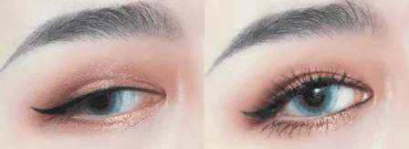 第三步:黑色眼线笔画好内外眼线,眼线尾部上翘,贴上假睫毛,再用睫毛膏刷一遍。