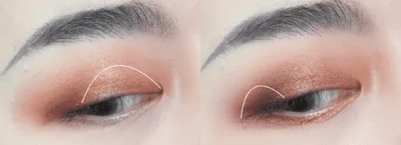 第二步:金色闪片眼影提亮上眼皮前半部分,深棕色眼影晕染眼尾三角区,金色眼影打亮卧蚕。