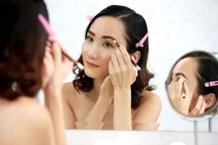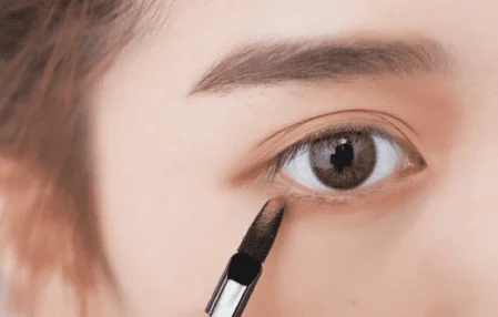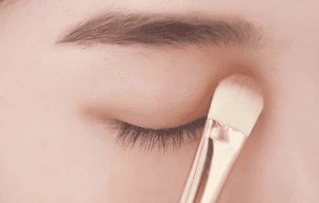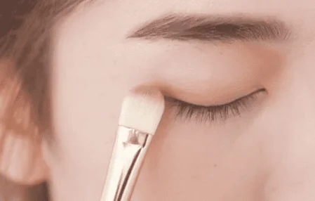 使用哑光棕色眼影轻轻地在双眼皮褶皱处贴近睫毛根部的位置铺底。