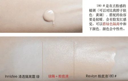 压嘴瓶用起来比广口的方便和卫生,黑色瓶子适合混合/油性皮肤,透明盖适合中干性皮肤。水润比较厚的质地,很好推开,用化妆刷上妆妆感比较重,用微湿的海绵/粉扑上妆妆感轻薄。雾面妆效,均匀肤色,遮瑕力不错,持久力很不错。上完一层粉底液后,偏橘调,最好在粉底前上一层绿色隔离中和一下颜色。持妆度好。