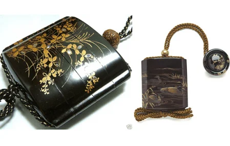 在日本,武士会将小巧精致的印笼瓶挂在腰上,几个小抽屉里存放着香料、草药、盐和**,用于缓解伤口疼痛。盒顶是“根付”,类似手机挂坠,以线穿过,固定印笼瓶的抽屉。瓶身常采用莳绘法或螺钿法,镶嵌贝壳和象牙。