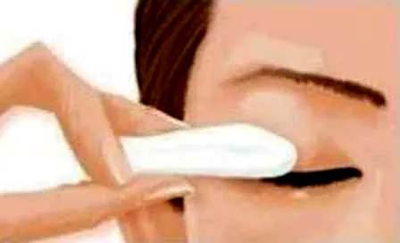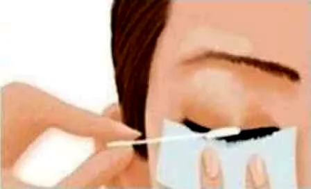 第四步:最后用化妆棉的四角轻轻擦拭下眼皮,将掉落到下眼皮的眼影和眼睫毛擦干净。最后用棉签将残留的睫毛膏擦拭干净。