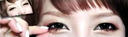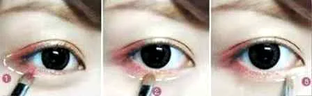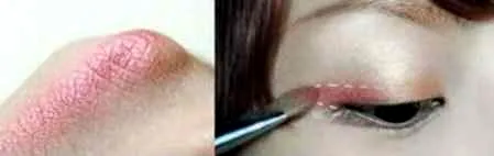 步骤三:用有荧光感的粉色在眼尾处呈<形由浅至深涂抹。