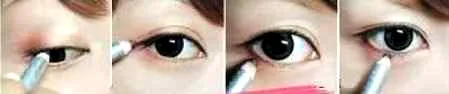 步骤五:用眼线笔沿着睫毛根部描画,从下眼头画至下眼尾,越靠近眼头的位置眼线越细,眼尾晕染添满小三角区。