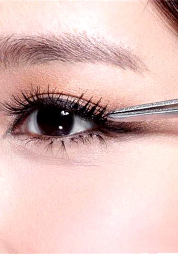 步骤三:选用眼尾加深的假睫毛,或者可以将一副假睫毛剪断,分别贴在眼尾部分,让眼尾看起来更开,眼睛会更大。