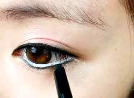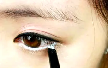 将白色多效眼线笔画在眼睑位置。让眼神显得更加的楚楚**。