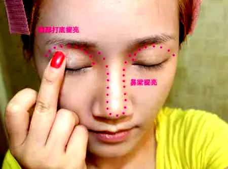 第四步:画眼妆之前,先用眼部打底膏打亮眼部,鼻梁也微微的提亮。