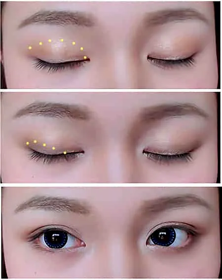 第四步:先用金色的眼影大面积的渲染眼窝,然后用咖啡色眼影渲染双眼皮褶皱处,眼尾微微的加深。