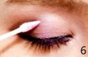 步骤六:用干净棉花棒把粉红色和咖啡色眼影的界线晕开,从眼头到眼尾的色彩有漂亮的渐层。
