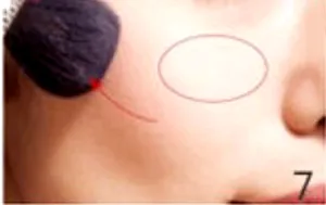 步骤七:选择蜜**腮红,斜刷在脸颊上,在最鼓的笑肌部份留白,改用珠光打亮,打造膨润苹果肌。