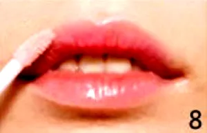 步骤八:先用浅色透亮唇蜜涂抹整个嘴唇,再用粉红色唇彩加强在上下唇**。整个减龄桃花妆就完成了!