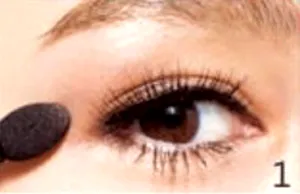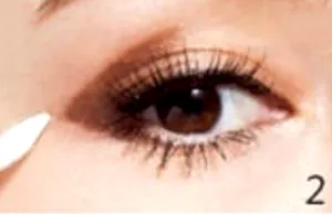 步骤一:用比肤色略深的浅棕色眼影打底,涂在眼皮后1/2部位的眼尾处,下眼尾也一样。
