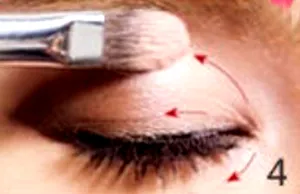 步骤四:挑选珠光不要太重的浅粉红色眼影,大面积刷在上下眼头、眼窝到眉骨下方的位置。