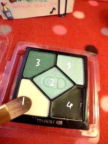 在眼影盒上标号数字方便使用,首先选择白色眼影(2号)为整个眼妆打底。