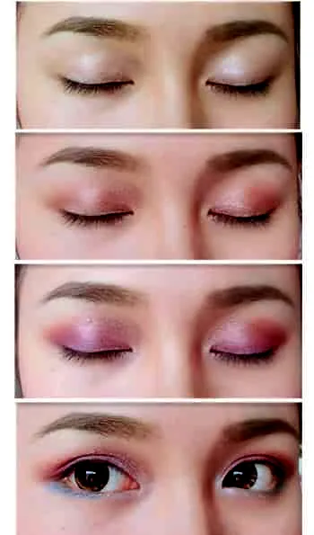 首先在整个眼窝处刷上米色眼影;再轻轻刷上棕色眼影;在眼窝二分之一处刷上紫色眼影;最后在下睫毛处刷上蓝色眼影,眼尾处加深。