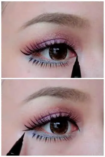 为了整个眼妆部分更精致,在假睫毛的前后都描画出眼线。