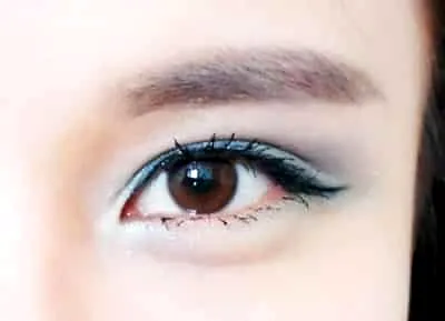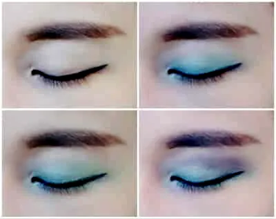 选择防水型眼线笔勾画出清晰的眼线,在眼窝处轻刷蓝色眼影,上下眼尾分别刷上薄荷绿眼影,最后在双眼皮上方用紫色眼影晕染,效果如图。