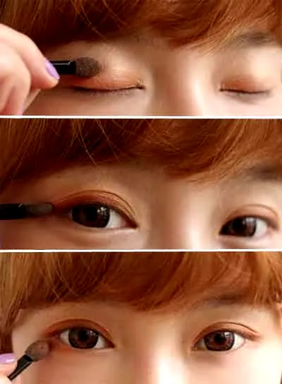 在眼窝轻刷一层橘色眼影,在双眼皮处用深棕色眼影,最后在下眼睑处涂抹深棕色眼影。