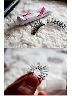 选择浓密型假睫毛沿着睫毛根部进行粘贴,粘贴时尽量紧贴眼线。