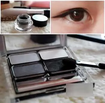 选择眼线膏画粗眼线,画到眼尾处时可适当平拉。在双眼皮的尾部刷上黑色眼影。