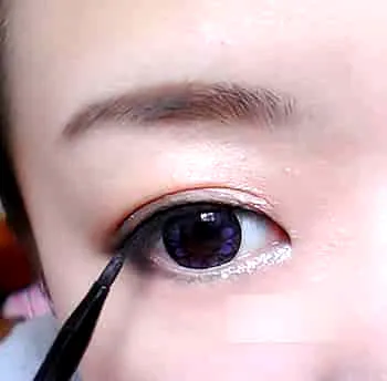 利用黑色眼线笔勾画内眼线,沿着睫毛根部勾画,很简单。