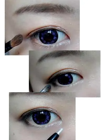 先用浅棕色眼影在双眼皮处推开,再用黑色眼影在眼尾的地方刷上,上下都需要哦,如图。