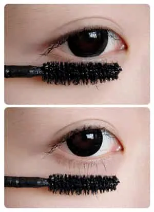 利用纤长型睫毛膏沿着上下睫毛根部刷,刷的时候手法要顺着睫毛的生长方向避免结块。
