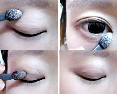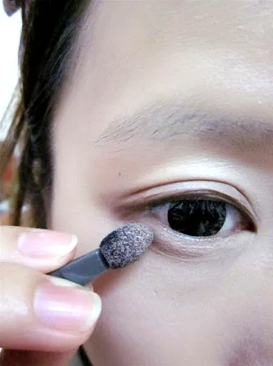 用白色眼影涂抹在的眼球部分和眼角部分,再用粉色眼影涂抹在双眼皮部分。