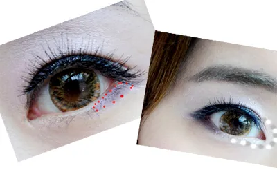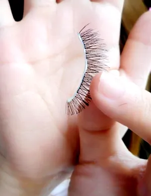 利用交叉型纤长假睫毛沿着睫毛根部进行粘贴,尽量不要超出眼线的位置。