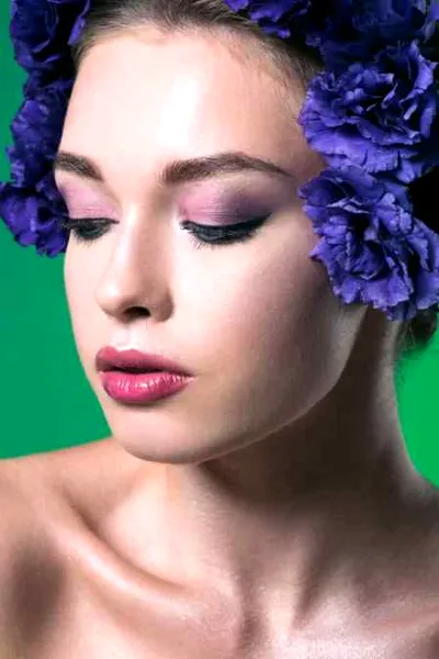 眼影部分我们先用眼部打底霜来提亮双眸,再用粉色眼影在双眼皮处晕染,而双眼皮的尾部晕染紫色眼影,让粉色和紫色进行叠加。