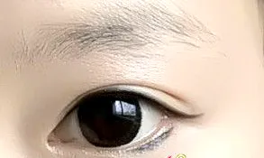 Step3:首先用裸色眼影打满整个眼窝,整体有亮片,提亮整体色调非常漂亮;深色晕染双眼皮折皱的部分。