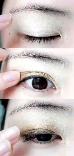 韩国妆容Step2:先在眼窝处涂上银白色眼影提亮,然后用指腹蘸取金棕色眼影涂在眼窝的二分之一处,最后将棕色眼影沿着双眼皮下方涂抹开。