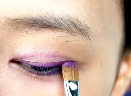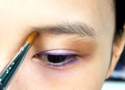 Step6:然后再选择紫色的眼影,刷上眼睑的位置,刚刚到双眼皮上方的位置,由睫毛根部开始往上刷起哦。