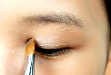 Step5:眼妆先选择珠光白色眼影,用眼影选轻轻沾取刷在眼窝处。