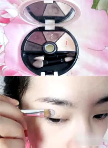 淡妆步骤四:在眼影盒里找到米色和棕色两种眼影,先在眼窝里涂满米色眼影,然后用棕色眼影勾勒大致轮廓。