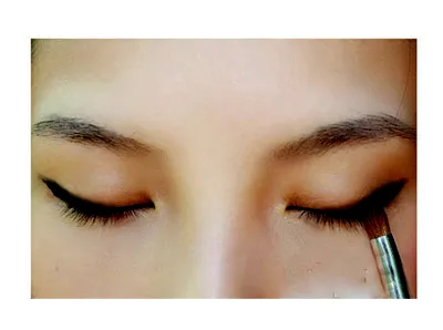 步骤五:找到深棕色眼影,从眼线的二分之一处开始往后轻轻晕染,下眼睑的尾部也需要同时晕染。